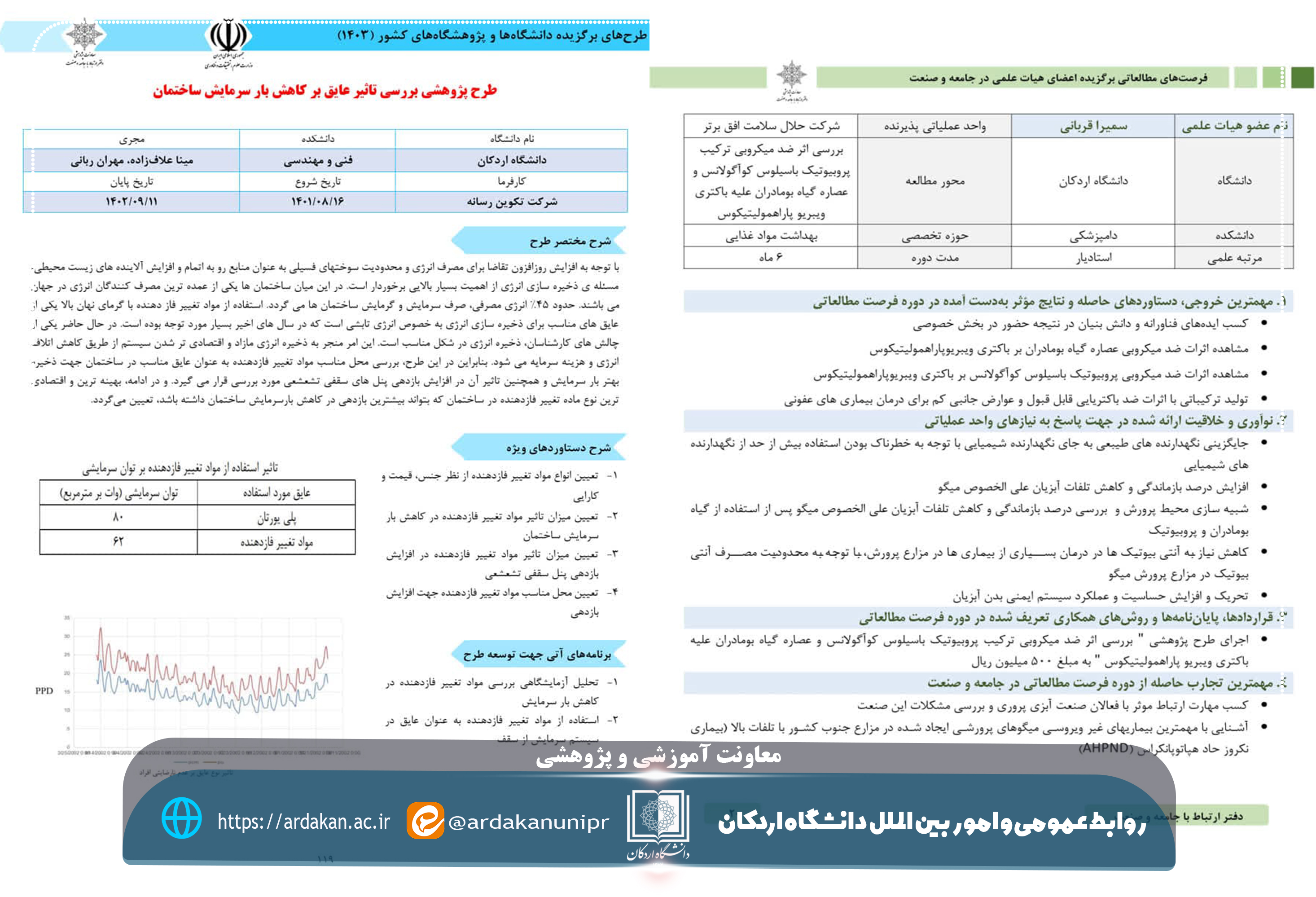- انتخاب طرح عضو هیات علمی دانشگاه اردکان به عنوان طرح برتر (احمدی روشن) استان یزد سال 1402